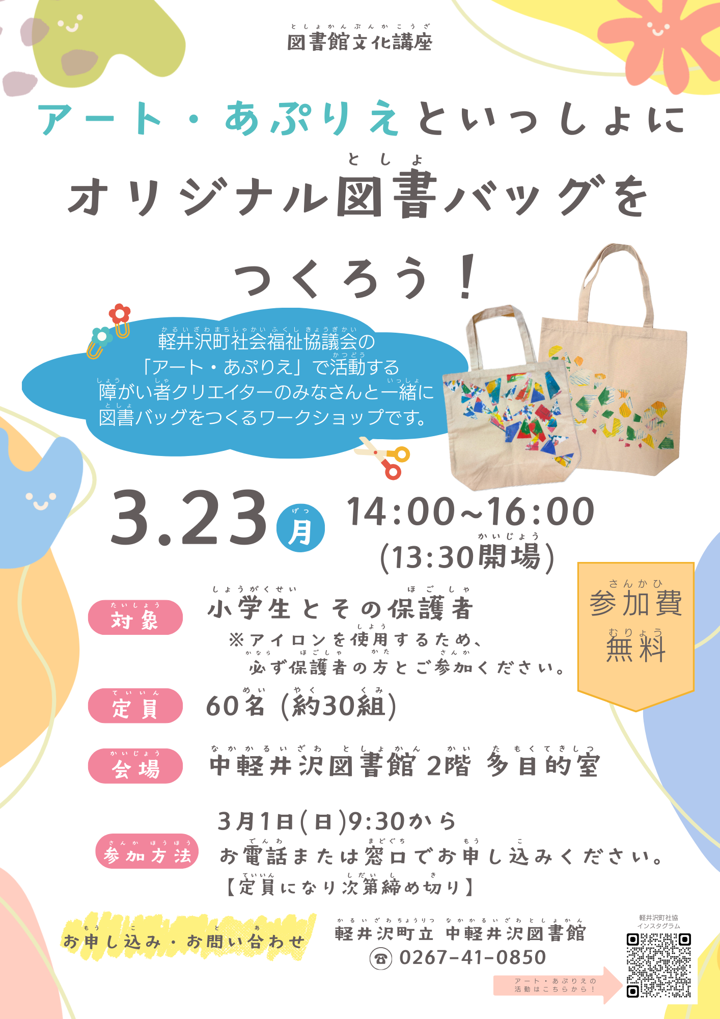 軽井沢町社会福祉協議会の「アート・あぷりえ」で活動する障がい者クリエイターのみなさんと一緒に図書バッグをつくるワークショップです。